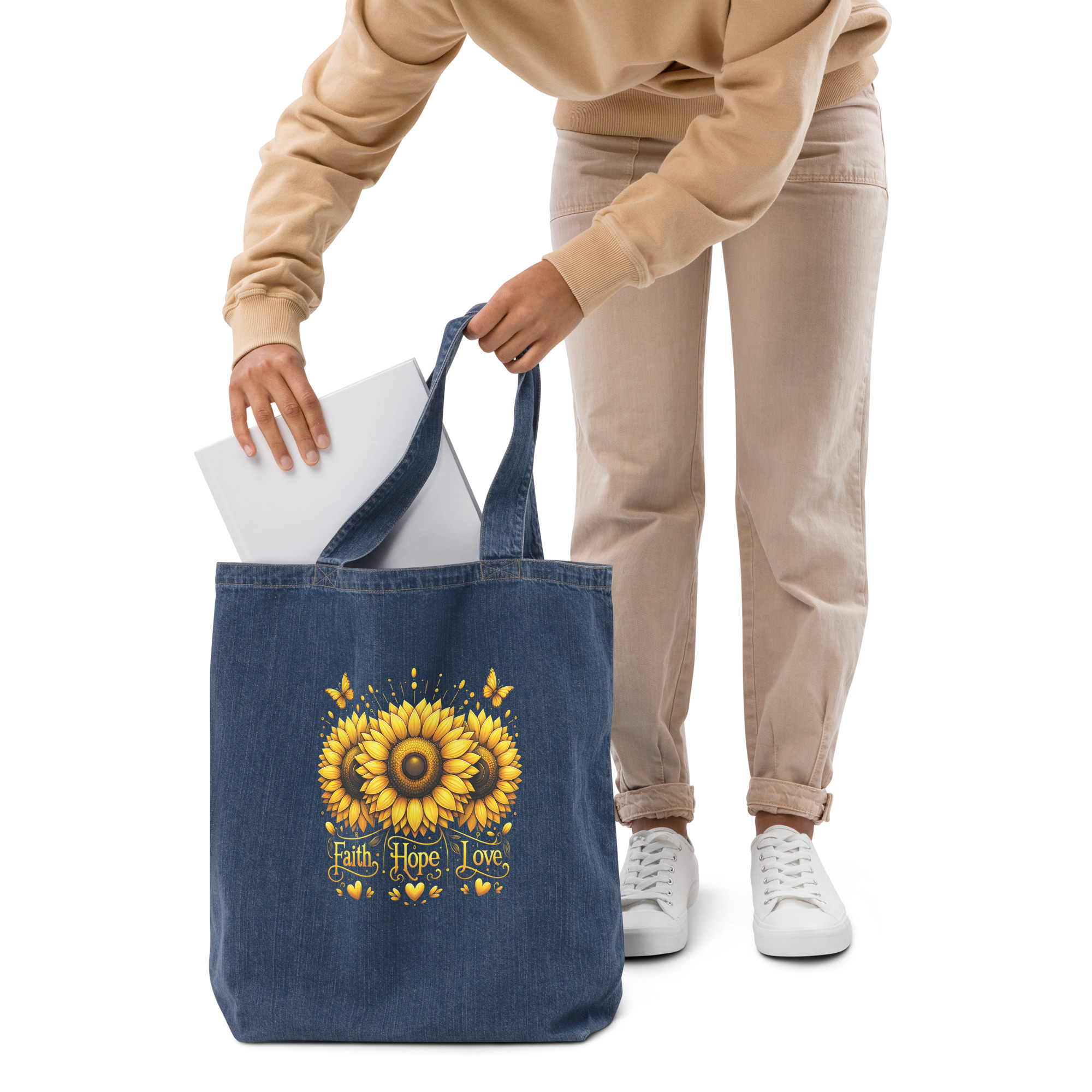 With its 30 lbs maximum carrying weight, the spacious organic denim tote bag will easily hold your books, groceries, or even gym gear. The long handles will provide extra comfort while the inside pocket will hold and hide your smaller valuables. Order it today and get carried away!